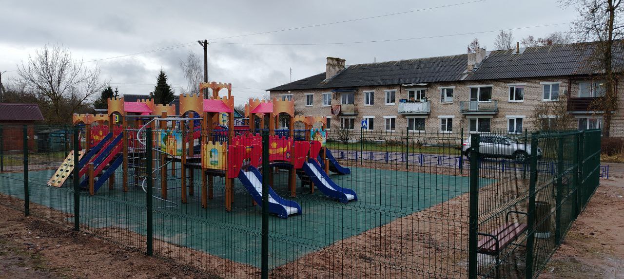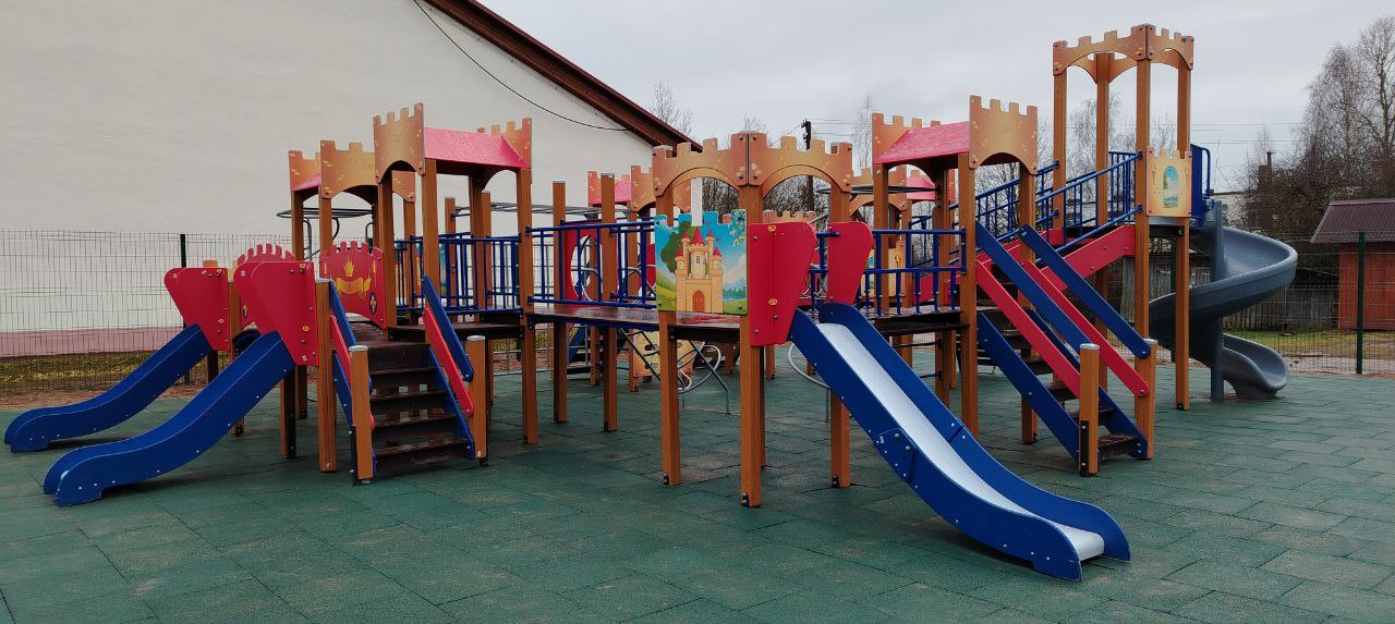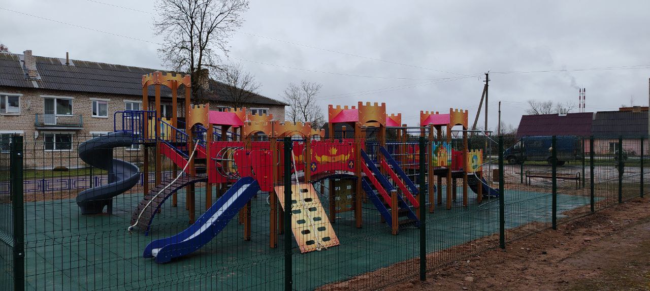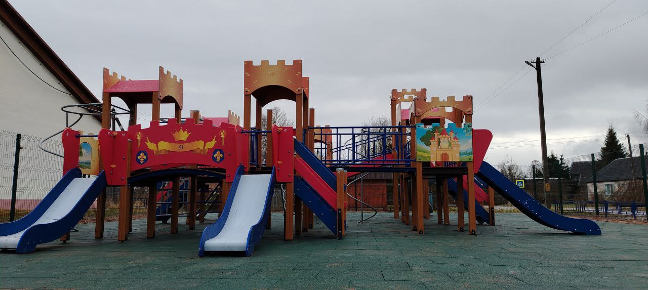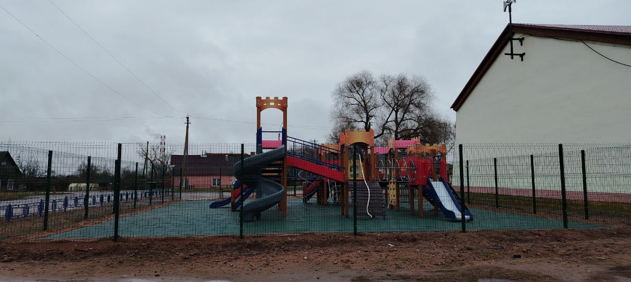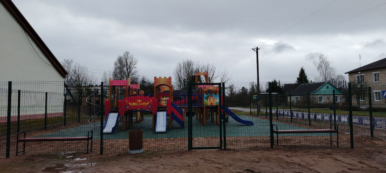 Детская площадка с резиновой плиткой и металлическим ограждением. Использовалось оборудование: