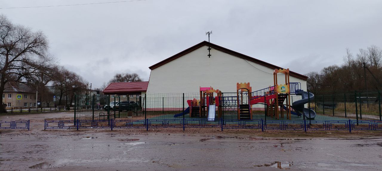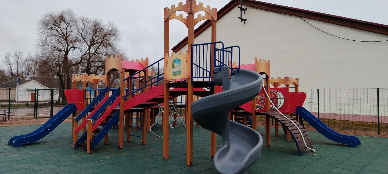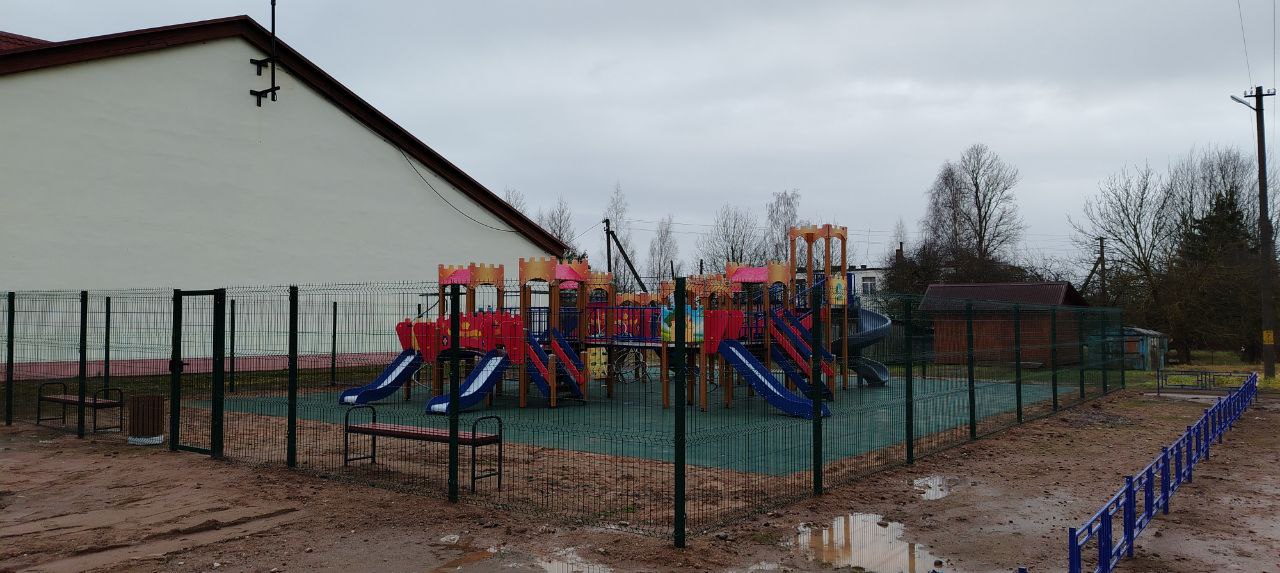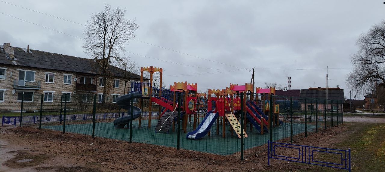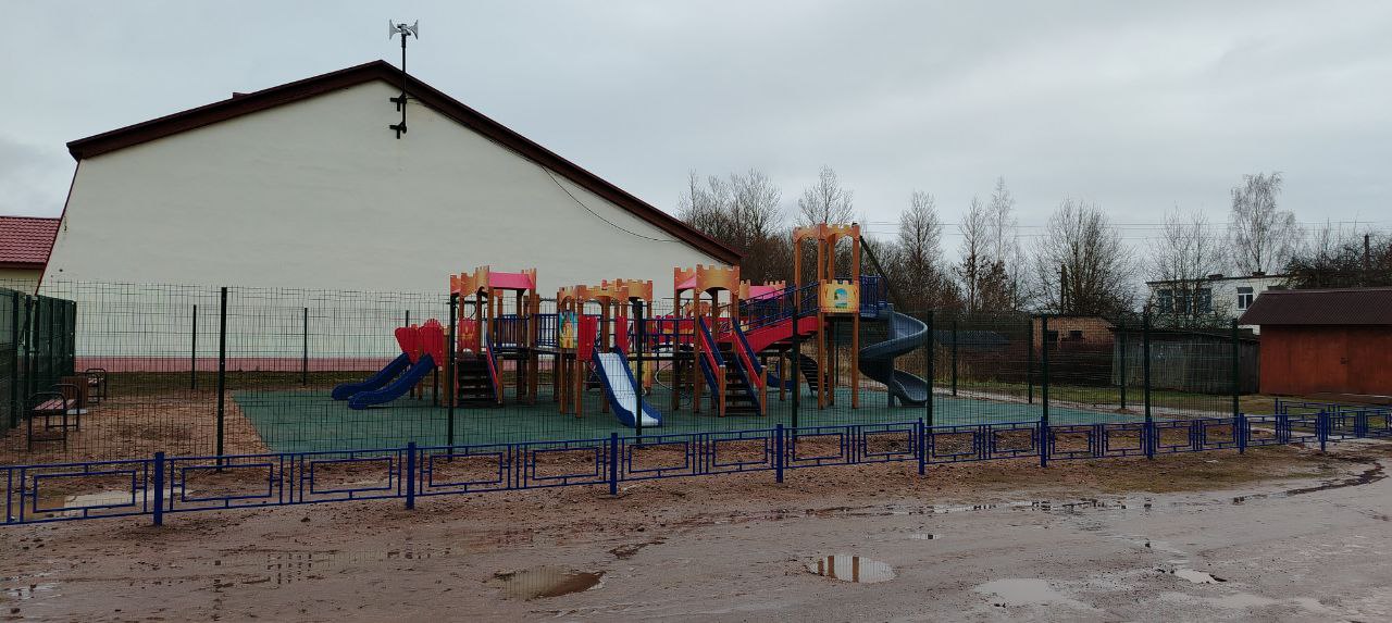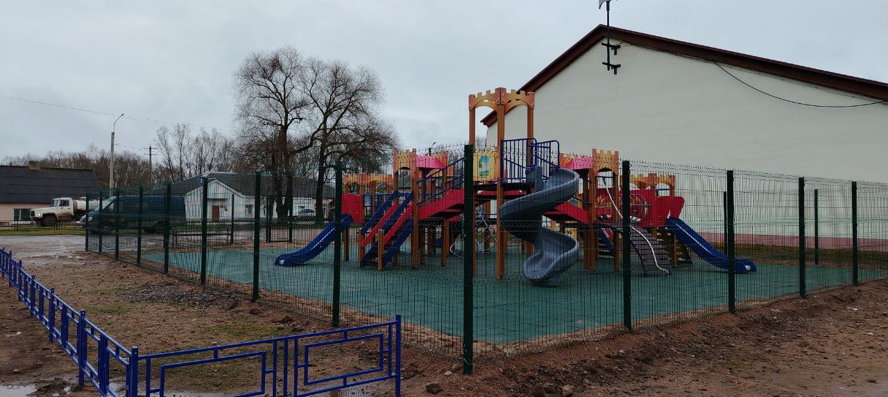 Детская площадка с резиновой плиткой и металлическим ограждением. Использовалось оборудование: